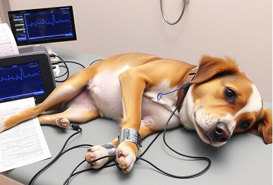 После осмотра животного подготавливают кожу для хорошего контакта электродов, размещая их на определенных местах тела домашнего питомца, обычно на конечностях и торакальной области. Затем регистрируют электрическую активность сердца с помощью специального аппарата в течение нескольких минут, чтобы выявить аномалии, аритмии, другие сердечные проблемы. Результаты анализируются врачом для дальнейшей диагностики, лечения.